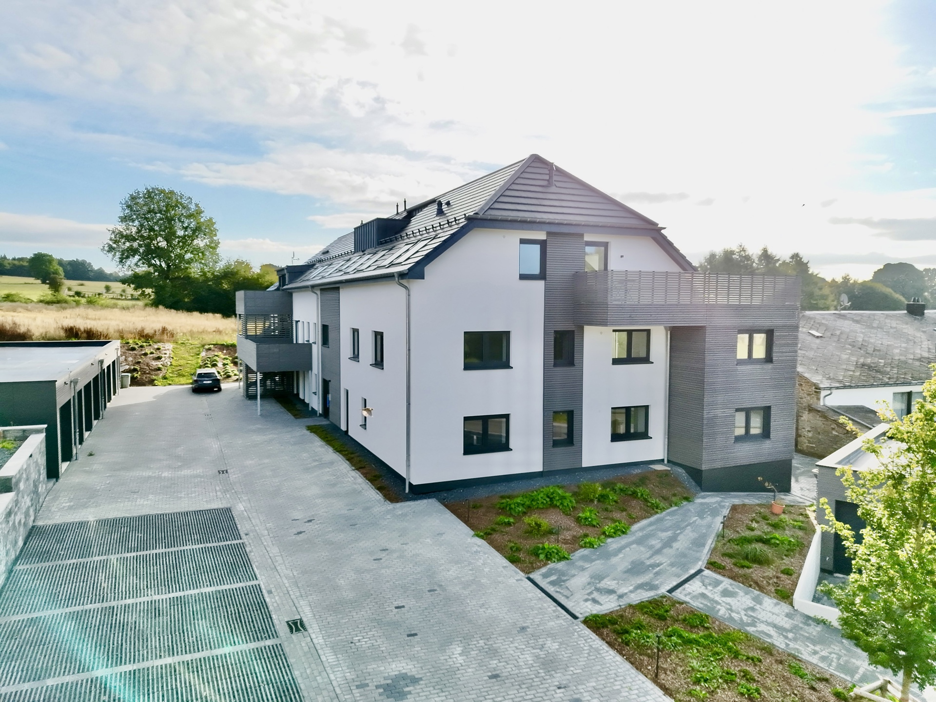 Jede Wohnung verfügt zudem über fertiggestellte Außenbereiche (Garten / Terrasse) sowie über einen Dachboden für Wohnung 8. Außerdem sind eine geräumige Garage von ca. 20 m² mit motorisiertem Sektionaltor und ein Außenstellplatz im Preis enthalten. Die Außenanlagen profitieren von einer gepflegten Gestaltung und integrierter Beleuchtung. Ein verstärkter Stromanschluss für eine Ladestation für Elektrofahrzeuge ist vorgesehen.