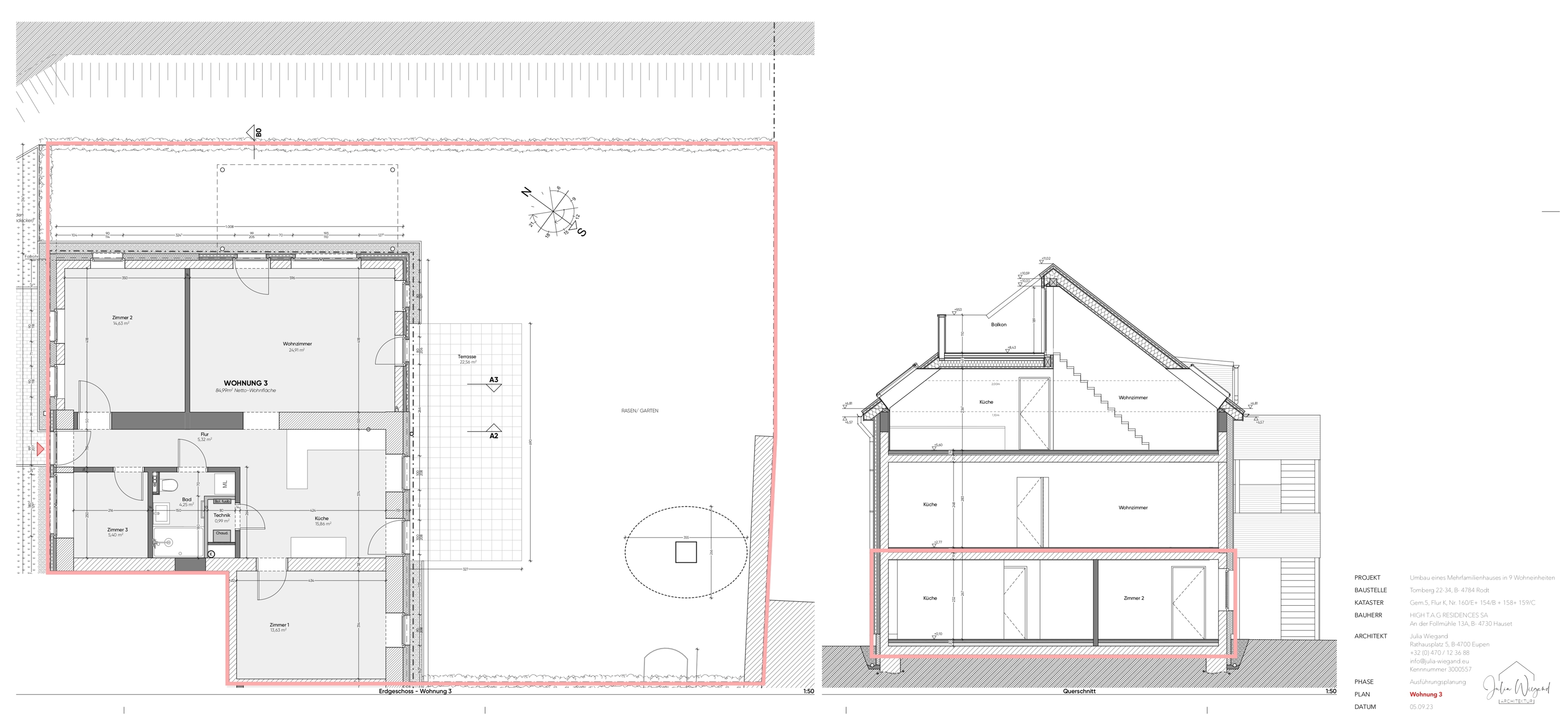 Chaque logement bénéficie en outre d’extérieurs (jardin / terrasse) parachevés et d’un grenier pour l’appartement 8. Enfin, un garage spacieux d’environ 20 m² avec porte sectionnelle motorisée ainsi qu’une place de parking extérieure sont inclus dans le prix. Les espaces extérieurs profitent d’un aménagement soigné et d’un éclairage intégré. Un raccordement électrique renforcé est prévu pour borne de recharge de voiture électrique.